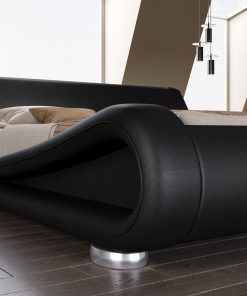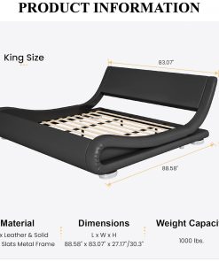 The King Modern Black Upholstered Platform Bed Frame with Sleigh Curved Headboard has a streamlined design along with a curved headboard which makes your room a contemporary and futuristic aesthetic. 120° 2-level adjustable height headboard gives the waist a comfortable rest, perfect for reading, playing mobile phones, watching TV, etc. The sturdy construction is composed of solid wood slats and heavy-duty steel with a bold round-shape leg design. No squeaky sound. Maximum capacity 800 lbs. Fully embedded design can prevent the mattress from sliding and provide a sweet dream. Mattress + spring box is recommended not to exceed 14 inches. 100% Premium PU leather filled with high-density PP cotton, ultra-soft texture, breathable, easy to clean, wear-resistant.