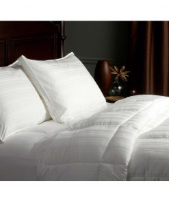 - 400-thread-count cotton dobby shell with multi-stripe pattern; end-to-end, sewn-through box construction with 60 ounces PrimaLoft Hypoallergenic filling