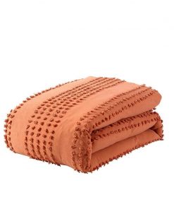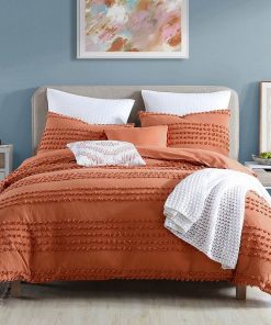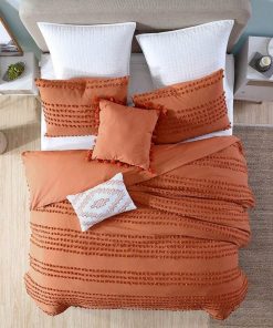 This 5-piece King 100% Cotton Boho Dot Comforter Set Burnt Orange tops your bed with laid back style. Complete set includes 1 comforter, 2 matching pillow shams, 2 square throw pillows. 100% pre-washed cotton that only gets softer over time and a clip dot design that lends visual and tactile appeal. This product is Oeko-tex certified to contain no harmful substances or chemicals, ensuring quality comfort and wellness. Crafted with premium pure cotton for breathability and superb moisture absorption ability to ensure a cool, comfortable, and refreshing sleep. The three-season comforter has a polyfill filling that plumps up easily, which means quick bed-making. This set requires hand washing. If you love a layered look, add a couple more accent pillows in complementary colors or bold patterns.