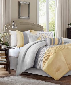 Relax in complete luxury with this King Size 7 Piece Bed In A Bag Comforter Set Faux Silk Yellow Gray Stripes. Sleek piping of the fabric on the comforter set and pillows gives a strong visual dimension. Everything is included with this jumbo set. Come with Comforter, Bed Skirt, 2 Pillow Shams, 3 Decorative Pillows! Machine wash, gentle cycle and separately. Tumble dry low. Spot clean decorative pillows.