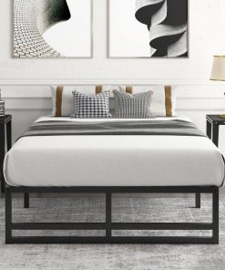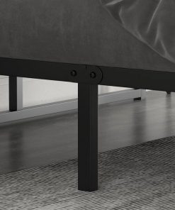 This Minimalist Storage Metal Platform Bed Black brings a sleek modern look to your bedroom. Made from metal with a black finish, it has an airy, open-frame design that leaves 14″ of under-bed space for shoes or storage boxes. This platform bed has pre-drilled holes, so you have the option to attach a headboard. The included slats are held in place with hook and loop fasteners and support the mattress of your choice. No box spring is required; a mattress and headboard are sold separately.