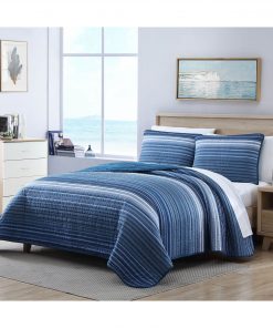 Update your bedroom with this Coastal Blue Stripe Reversible 100% Cotton Quilt Set. Features a striped design in rich shades of blue and white and reverses to a solid blue for versatile bedroom looks. Constructed with soft and breathable cotton, this quilt ensemble is a perfect layering piece for your current bedding set or can be used on its own in the warmer months. This quilt set is prewashed for added softness and machine washable for easy care. The quilt features a cotton/polyester blended fill.