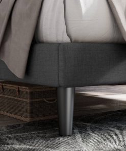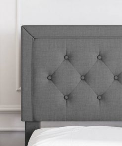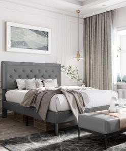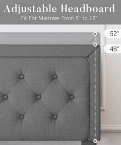 Upholstered linen and tufted button headboard, this classic silhouette matches a variety of bedroom styles. Thick dense foam padding gives you comfortable touch. The Interior steel framework supports your mattress firmly. Smartly packed all parts with instructions and tools in one box. Only takes about 30 minutes to assemble. Fabric upholstered bed frame with adjustable headboard. The distance between each slat is about 4 inches. The slats of this bed have to be screwed on and not hook & loop fastener. 6″ is a little low for the bed, but you can still use it if you do not care about the gap between the mattress to the headboard.