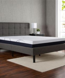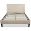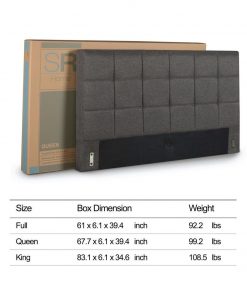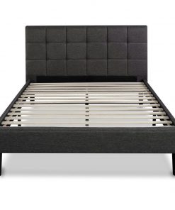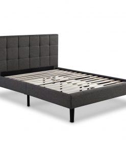 This King size Dark Grey Upholstered Platform Bed with Headboard will transform your bedroom. It ships in one carton with the frame, legs and wooden slats conveniently located in the zippered compartment in the back of the headboard for easy assembly. This contemporary upholstered queen platform bed features a square stitched headboard and low profile footboard style frame, with wood slats and exposed feet for support. The dark grey upholstery looks luxurious and this platform bed makes an excellent addition to any bedroom.