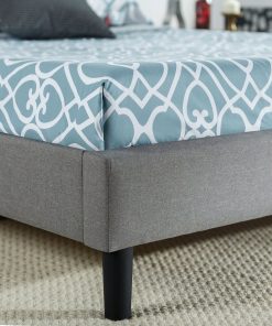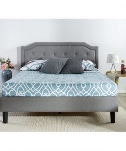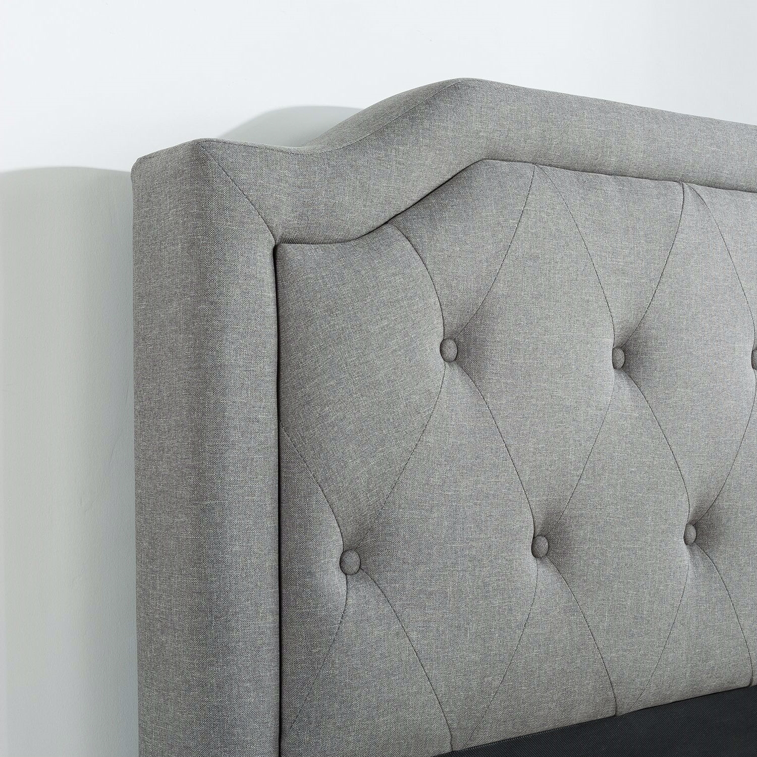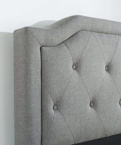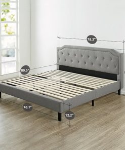 This King size Grey Upholstered Platform Bed with Classic Button Tufted Headboard will transform your bedroom. It ships in one carton with the frame, legs and wooden slats conveniently located in the zippered compartment in the back of the headboard for easy assembly. This classic platform bed features a scalloped headboard and low profile footboard style frame, with wood slats and exposed feet for support. The grey button tufted upholstery adds softness and provides a classic framework for your mattress.