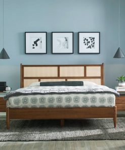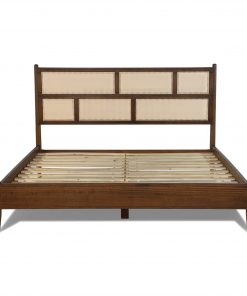 King Size Hardwood Platform Bed Frame with Cane Paneling Headboard in Walnut