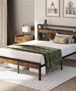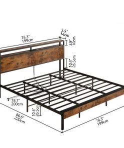 This King Size FarmHouse Bed Frame w/ 2-Tier Storage Headboard Power Outlets provides storage space equivalent to a simple nightstand, keeping any room tidy. Thoughtful design anti-slip strips between the bed slats are designed to help eliminate noise. Corner guards suitable for bed frame size can avoid sharp collisions. No box spring is needed the mattress can be placed directly on the slats of the bed frame, saying goodbye to box springs.