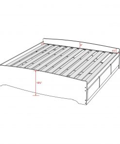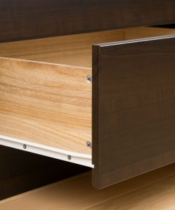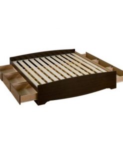 Our King Platform Storage Beds combine extra large drawers for plenty of storage space with a slat support system that requires only a mattress. Wood slats are positioned lengthwise to distribute body weight evenly, minimize the amount of motion transfer and take the place of a box-spring. Metal braces under the slats provide additional stability. Underneath are 6 large storage drawers (20” depth) that run on smooth running metal drawer glides. Drawers open easily with finger pulls located at the bottom of drawer fronts and knobs have been eliminated to prevent bedclothes from catching. They are large enough to hold anything you need to store: linens, blankets, clothes, socks and even shoes are just a few ideas. Coordinate with other espresso furniture items like our floating headboard with nightstands. Overall bed height is 21” if used with an 8” thick mattress. Available in two attractive finishes: Black and Espresso overlay laminates. This product is made from composite woods with plywood slats. It ships flat-packed (in three cartons) and self-assembly is required. Detailed and easy-to-follow instructions are included.