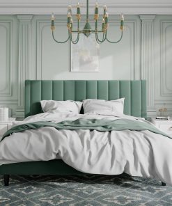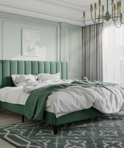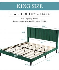 Upholstered in plush velvet, our luxurious bed is the best choice for your classy life. This King size Modern Green Velvet Upholstered Platform Bed with Headboard also can seriously upgrade your room’s aesthetic. A sturdy steel frame and durable wooden slats offer pretty stability and durability. There are feet on the headboard post and all feet are required to be attached to the frame. Do not use highly corrosive solutions when cleaning the product.