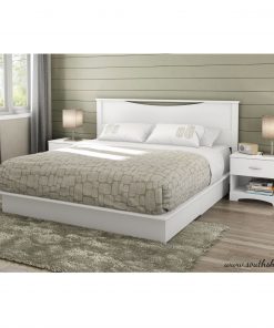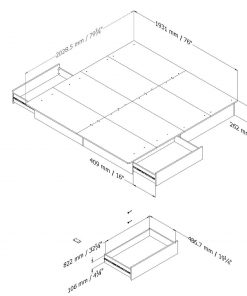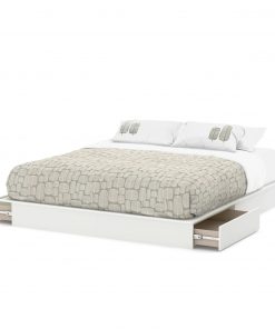 This King size Modern Platform Bed with Storage Drawers in White Finish has a timeless look and blends easily in any décor. Provides storage with 2 large drawers, 1 on each side, equipped with ball-bearing full-extension drawer slides. Economic choice since it does not require a box spring. Weight capacity is 500 lbs. Can be attached to the headboard (3107290) for a complete kit. Also available in Chocolate or Pure Black finish. The interior drawer dimensions are 32-1/4-inch wide by 19-1/4-inch front to back. Measures 76-inch wide by 79-3/4-inch long by 10-1/4-inch high. Delivered in 2 boxes: BOX#1: 47-3/4 in. by 21 in. by 6-1/2 in., 107 lbs.; BOX#2: 46 in. by 21-1/2 in. by 5-3/4 in., 100 lbs. The top surface of the platform bed is laminated. Mattress and accessories not included. New and improved drawer bottom made with wood fibers. Manufactured from certified Environmentally Preferred laminated particle panels. Complete assembly required by 2 adults. Approximate assembly time: 1:45. Tools are not included. 5-year limited warranty. Made in Canada.