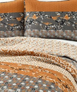 This stylish King Size Orange Grey Floral Birds Reversible 3 Piece Quilt Set is loaded with color and works both in a contemporary or traditional room. It has printed pieced fabrics on one side and a full print on the reverse. The perfect weight for year round use, this 3 Piece Quilt Set has continually ranked among top sellers. The bright colors and unique patterns on 100% cotton are popular with all ages, and the look is perfect for a master bedroom or guest bedroom. Our 3 Piece Quilt Set includes a soft cotton quilt and two matching pillow shams which complete the look.