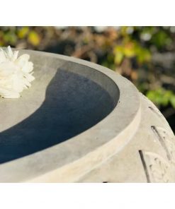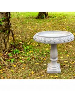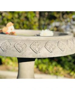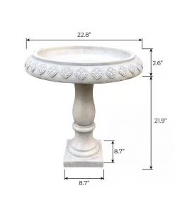 This Lightweight Weathered Concrete Fiberglass Stone Birdbath – 22-inch Diameter with a flower encased in a diamond pattern that is engraved along the rim of the bowl is a timeless piece that is pleasing to the eye and that will draw attention to your garden. A shallow and wide bowl assures that multiple small birds can drink and bathe safely at the same time. Bird bath holding water or feed can help to attract birds to stay in your yard, bird will help to aerate soil for more water and nutrients and beautify your garden lawn. Made of concrete and weather-resistant fiberglass that have all the advantages of these materials, such as strength, durability, weather and damage resistance, and long-lasting color.