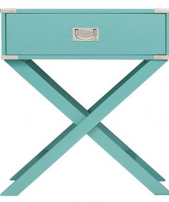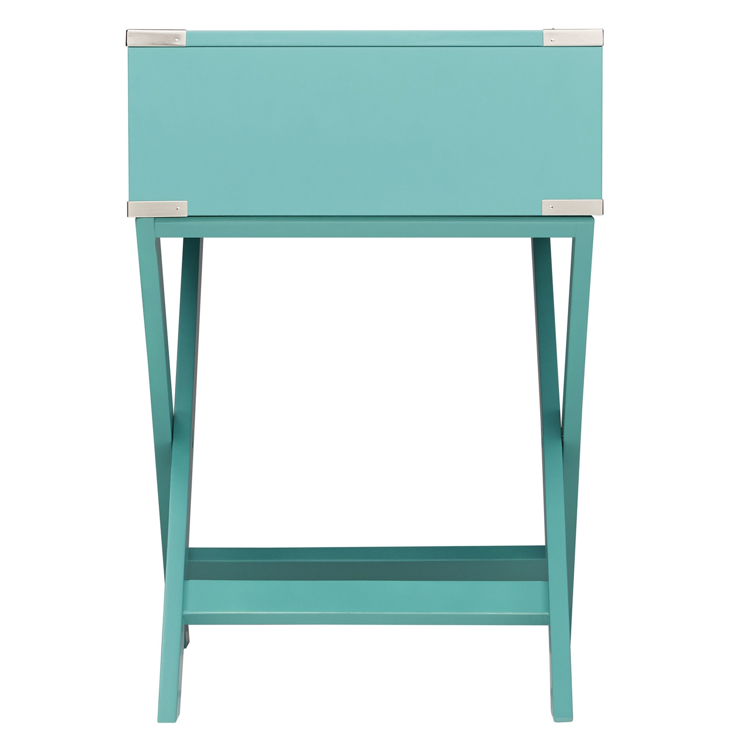 Featuring durable wood construction and detailed dovetailed drawers, this Marine Green Turquoise 1-Drawer Modern End Table Nightstand offers traditional and long-lasting design. A variety of both neutral and bold finish options makes this end table perfect as a complementary addition to your living space or as a colorful focal point. Treat surface with care. Surface is resistant to scratches but is not scratch resistant. Clean surfaces with a dry or damp soft cloth. Do not use abrasive cleaners. Hardware may loosen over time. Periodically check that all connections are tight.
