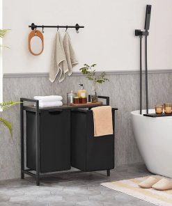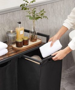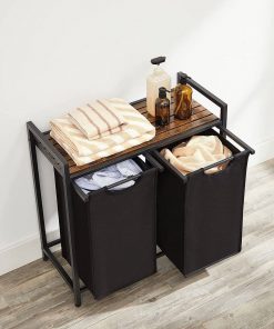 So many storage options that this Metal Wood Industrial Modern Laundry Sorter Hamper Black/Brown can offer you! 2 pockets made of Oxford fabric help you sort laundry by color, and a top shelf keeps detergent and fabric softener handy. Crafted of particleboard and steel, this laundry basket will stand steady and firm! The adjustable feet and anti-tip kits help prevent unwanted wobbles or accidental tipping.