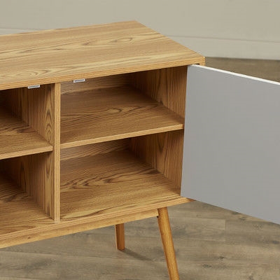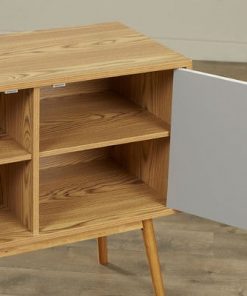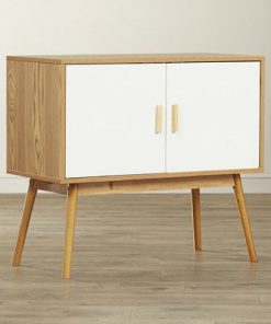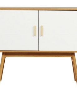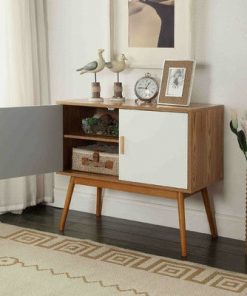 Clean lines fuse with a 2-tone finish to round out this Mid-Century Modern Console Table Storage Cabinet with Solid Wood Legs, an eye-catching addition to any ensemble. Use it to anchor the entryway in modern style then top it off with charming flea market finds or shimmering objets d’art.