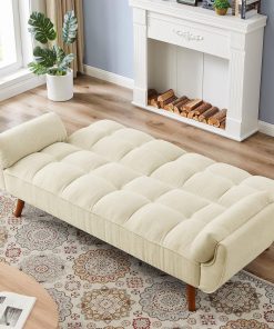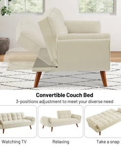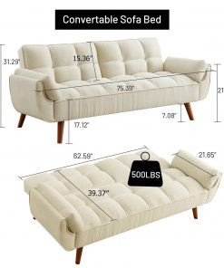 This Mid-Century Modern Sleeper Sofa Bed in Beige Linen Polyester Tufted Upholstery is built on eucalyptus wood frame,pillow top arm and tapered solid wood legs ,sturdy and durable for daily use. The seat and back cushions filled with high density sponge and sinuous spring ,comfortably sleeping on this couch. Easy to pull out and stow the adjustable split-back design futon sofa bed, reclined to lounge or sleeping position.When it’s time to snooze,lay the backs down,turn this versatile sofa couch into a twin-size sleeper. Crafted of linen tufted ,a great mid-century modern inspired sofa bed, fits well for any occasion ,an accent addition to your living room,home office or guest room.Great for small space. Easy to assemble. The only assembly required is clipping the arms and attaching the legs.It takes about 20 minutes.The armrests come zipped underneath the seats of the couch.