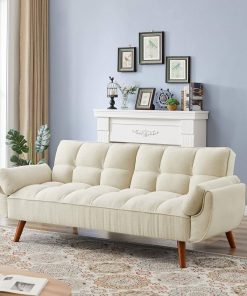 This Mid-Century Modern Sleeper Sofa Bed in Beige Linen Polyester Tufted Upholstery is built on eucalyptus wood frame,pillow top arm and tapered solid wood legs ,sturdy and durable for daily use. The seat and back cushions filled with high density sponge and sinuous spring ,comfortably sleeping on this couch. Easy to pull out and stow the adjustable split-back design futon sofa bed, reclined to lounge or sleeping position.When it’s time to snooze,lay the backs down,turn this versatile sofa couch into a twin-size sleeper. Crafted of linen tufted ,a great mid-century modern inspired sofa bed, fits well for any occasion ,an accent addition to your living room,home office or guest room.Great for small space. Easy to assemble. The only assembly required is clipping the arms and attaching the legs.It takes about 20 minutes.The armrests come zipped underneath the seats of the couch.
