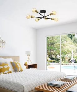 This Mid-Century Sputnik Style 6-Light Black Gold Ceiling Light – Semi Flush Mount comes with multi-directional 6-lights, its arms are movable to enable different lighting arrangements as you need. The Mid-Century Modern style with exposed bulbs brings back a nostalgic & reminiscent feelings, while its minimalist shape & contemporary colors make this ceiling light fixture a refined and easy fit with various room settings such as modern/contemporary, transitional, minimalist, or even industrial, a widely used ceiling chandelier light in bedroom, foyer, entrance hall, dining room, lounge or office. Bulbs need to be purchased separately.
