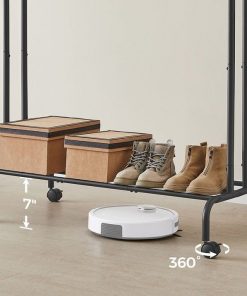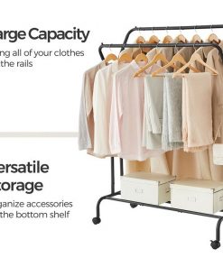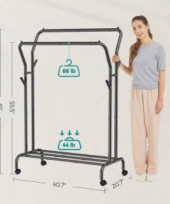 Bring everything with you anywhere you go with this Sturdy Modern Industrial Minimalistic 2 Rod Wheeled Laundry Sorter Clothing Rack! With a high rail and a low rail for hanging clothes of different lengths, hooks on both sides for bags and hats, and a bottom shelf for boxes and shoes, this clothes rack keeps all your essentials in one place. The 4 swivel wheels make it easy to move the garment rack to different rooms. For added convenience, 2 of the wheels can be locked in place to keep the rack stationary. The 16.5″ spacing between 2 clothes hanging rails allows air to easily flow through, promoting quick drying. It offers ample hanging area to prevent crowded, messy clothes, making them easier to access. With bolts securing the 1″ thick steel tubes, this clothing rack has a stable frame that can hold up to 220 lb. Each rail has a max. static load capacity of 66 lbs. each hook up to 11 lbs. and the bottom shelf can hold up to 44 lbs.