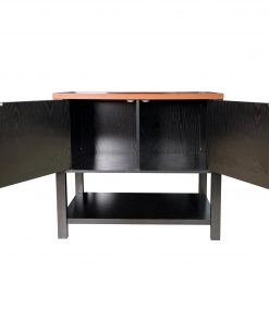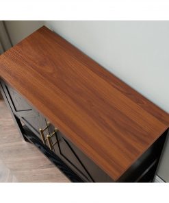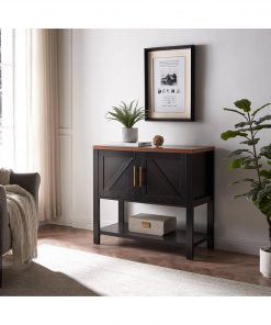 The Modern 2 Drawer Wooden Storage Console Table Black/Walnut brings classic style to your humble abode with a clean lined silhouette and open design lower shelf. This sturdy console is crafted from manufactured wood. It sports 2 cross panel fronted doors revealing 2 spacious interior cabinets ideal for stowing away larger necessities and keeping them out of sight while the accented metal door handles add a high-end and modern appeal.