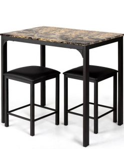• Modern 3-Piece Dining Set Brown Faux Marble Table-Top and 2 Black Chairs Stools