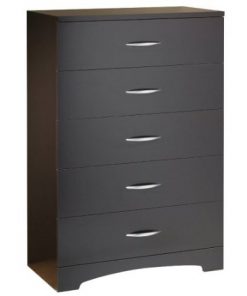 This Modern 5 Drawer Bedroom Chest in Chocolate Finish has a timeless look and blends easily in any decor. The contemporary lines are soften by the curved kick plate. Matte chrome handles are adding character and value to the furniture. This chest is made of recycled CARB compliant particle pannels. The glides are made of polymer and include dampers and catches, creating a secure environment for little ones. . This chest has to be assembled by two adults. Measures 30 inches wide by 16 inches deep by 44 inches high. It is delivered in one box measuring 52,5 inches by 19,75 inches by 6,75 inches and weights 82 pounds. Tools are not included. 5 year warranty. Made in Canada. Manufacturer style number: 3159035.