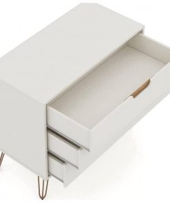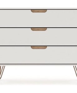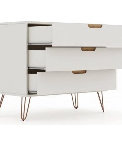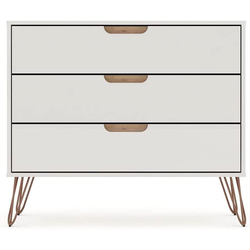 Bring some modern style to your home with this Mid-Century Scandinavian style dresser. This Modern Bedroom Scandinavian Style 3-Drawer Dresser in Off-White Natural Finish will fit into even the smallest of homes while still bringing sleek and practical style. With ample storage and minimalistic mid-century modern style, the Modern Bedroom Scandinavian Style 3-Drawer Dresser in Off-White Natural Finish is the perfect accompaniment to any bedroom space. Cutout handles keep the piece feeling fresh, and triple drawers offer plenty of space for clothing, personal items, and more. A display top provides space for showing off a decorative lamp or for sharing favorite framed family photos, travel trinkets, and perfume trays. Set this dresser under a mirror or painting to complete your space and create an instant bedroom focal point. It wont take up much room but will seriously deliver on quality and style. This piece is made of high-quality solid wood with metal accents to ensure durability and lasting beauty. Choose between cutout edge handles or a flush design to make this piece truly your own. Undeniable quality, a stunning look, and convenient storage come together to make this piece a must-have for any home or apartment.