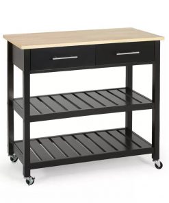 • Modern Black Kitchen Island Cart with Wood Top 2 Drawers and 2 Bottom Shelves