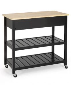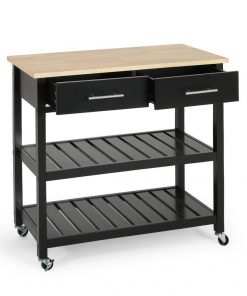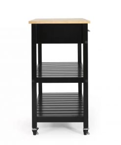 Let your kitchen stand in utter sophistication with this Modern Black Kitchen Island Cart with Wood Top 2 Drawers and 2 Bottom Shelves. From its open slat shelving to its smooth drawers, our kitchen cart offers ample organizational space to upgrade your living standard with a breeze. This piece offers a stunning contemporary style and convenient design that gives you plenty of options to effortlessly and efficiently store your kitchen accessories. Crafted with sturdy wood and rolling casters, our kitchen cart brings a fresh yet timeless look for you to utilize with ease.