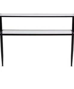 This contemporary console table will look great in your entryway, dining room, living room, or along any hall wall in your home. Sturdy black metal frame borders the tempered glass top and bottom shelf. The tapered Legs have adjustable floor glides so you can keep the table flat and level on uneven floors. Makes a great sofa table or display shelf for photos and decorative items.