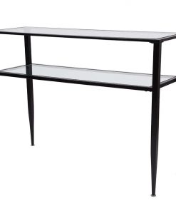 This contemporary console table will look great in your entryway, dining room, living room, or along any hall wall in your home. Sturdy black metal frame borders the tempered glass top and bottom shelf. The tapered Legs have adjustable floor glides so you can keep the table flat and level on uneven floors. Makes a great sofa table or display shelf for photos and decorative items.