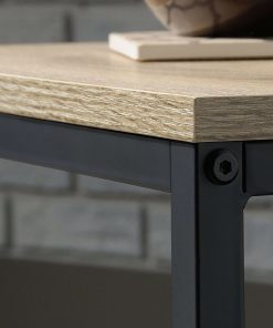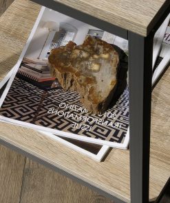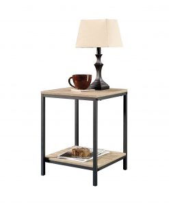 Give your lamp and coasters a new home with this Modern Black Metal Frame End Table with Oak Finish Wood Top and Bottom Shelf. It features a spacious tabletop surface along with an open shelf to store and display books, plants, magazines, or your collection of coffee mugs. Constructed with a durable, black metal frame and finished on all sides in Charter Oak, this versatile end table is a great fit in any room, even the bedroom!