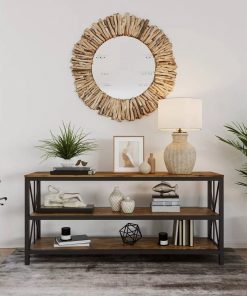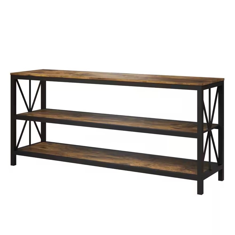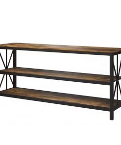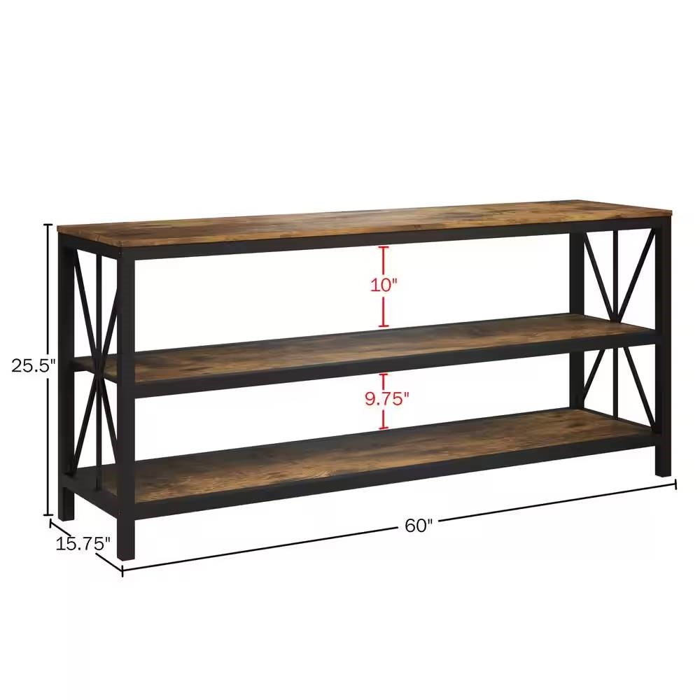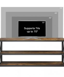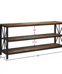 This Modern Black Metal TV Stand with Barn Wood Finish Shelves – TV’s up to 70-inch is ideal for up to a 70-inch flat-screen television while offering a simple and clean-lined rectangular silhouette with its open back and metal frame. It is sure to add style and functionality to any home. This TV console features 3 tiers of 60-inch-long shelves with ample space to personalize the open style display with accent pieces and storage for cable boxes, DVD, Blu-ray players, books, or movies. This entertainment stand is made of MDF wood with a reclaimed Barnwood look along with X-shaped sides for stability and can hold up to 150lbs on the top shelf and an additional 30lbs on each of the lower two shelves. This attractive TV entertainment center can also be used as a console table or bookshelf. Its modern farmhouse style and brown woodgrain look can instantly upgrade your living room, bedroom, or office space. Material: MDF with a PVC Finish and Metal. Dimensions: (L) 60 x (W) 15.75 x (H) 25.5; Distance Between Shelves: (Top to Middle) 10; (Bottom to Middle) 9.75. Color: Brown Woodgrain Reclaimed Barnwood Look and Black.
