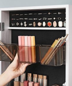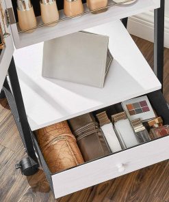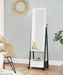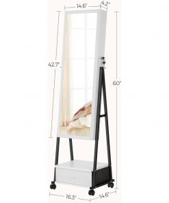 Full length mirror? Right in front of you. Storage space? With 92 earring places, 36 rings slots, 1 bracelet rod, and 32 necklace hooks, this Modern Black Metal White Wood Jewelry Armoire Cabinet Organizer Mirror on Wheels holds your ever-growing jewel collection, zealously. Yes! 2 facial mask bags, a 3-slot brush tray, a 10-slot lipstick tray, and 4 shelves inside the cabinet corral all your beauty secrets. Look! A shelf and a drawer below hold bags or books; as for greenery, decorations? Why not? Since your jewelry reflect your taste, keep them in style in this eye-pleasing jewelry organizer—with a cabinet in a rustic brown finish and rich wood texture, it oozes a chic and classy appeal. Fill it, move it, lock it in place, check out your outfit with the large, full-length mirror. You can easily glide this jewelry cabinet with 4 wheels from one room to another and lock it in place as you get ready for a night out. With a pre-assembled cabinet, simply attach the frame and the bottom shelf by following the illustrated instructions, then insert the fabric drawer, and that’s it—now it’s your time to make yourself look stunning. Say Goodbye to Chaos and Embrace Shipshape. This integrated jewelry cabinet is what you need for better organization. Featuring a spacious jewelry cabinet, a full-length mirror, an open shelf, and a drawer, it corrals all the out-the-door necessities in one place, maximizing space and saving time.