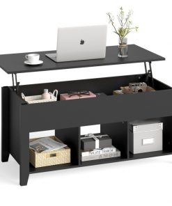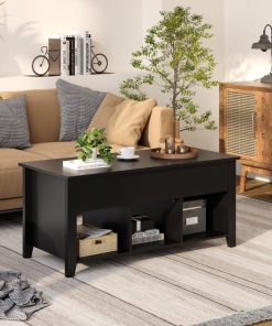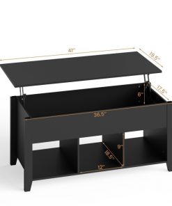 This sturdy multi purpose Modern Black Wooden Lift Top Coffee Table is a great addition to any sitting space. The top of this modern coffee table can be lifted up, with the durable solid lifting mechanism inside. The lifting mechanism is made of iron, ensuring long-term use. The springs at 2 sides help you to lift the top up and lower down, the height can be fixed at 24 inches to meet your various needs. Under the top, this table hides a large space to store your daily objects. You can put books, magazines, remote controls, keeping them in reach and away from dust. Comes with 3 open shelves at the bottom can collect blankets, toys, or snacks, improving space utilization.