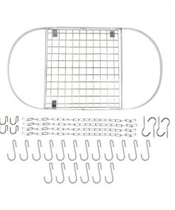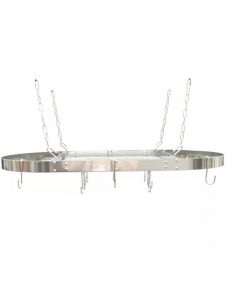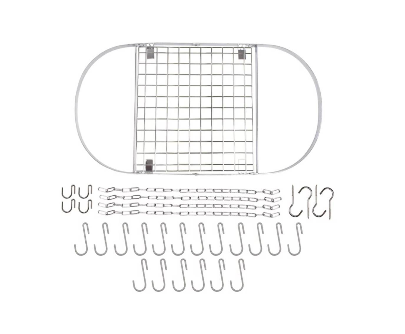 - Includes: 1 oval rack frame, 1 grid shelf, 4 lengths of chain, 4 ceiling hooks, 4 rack hooks, 12 pot hooks, 6 extra hooks
