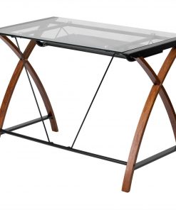 A terrific solution to all your work-at-home needs, this Modern Cherry Finish Glass Top Writing Table Computer Desk with Keyboard Tray flaunts a captivating modern design with ample work space and nifty features to make any task simple. The glass top and cross frame are wonderful for establishing an updated look in your home office. The sturdy legs stand on balancing floor glides and feature a rich cherry finish that’s complemented nicely by the sleek black of the sliding keyboard tray and the tempered glass border. Some assembly is required.