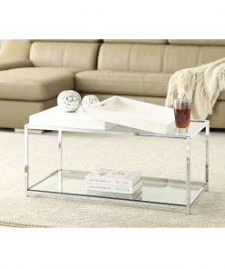 This Modern Chrome Metal Coffee Table with 2 White Removable Trays combines urban design and multi-function use. the palm beach coffee table features two removable white trays that can be reversed to use as a flat surface or as serving trays. clear tempered glass table top allows use of coffee table with or without trays.