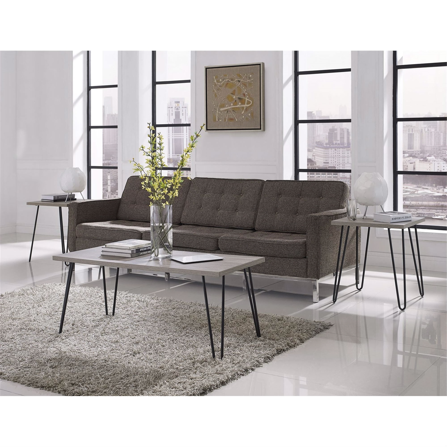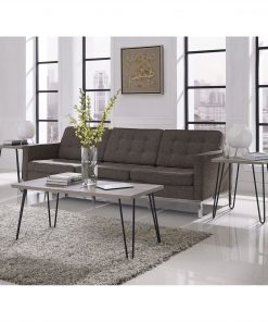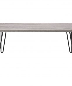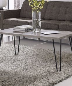 Blending retro and modern design elements, this Modern Classic Vintage Style Coffee Table with Wood Top and Metal Legs table makes a big impression in any space. Features hairpin metal legs in a gunmetal gray finish, with a oak wood grain finished top.