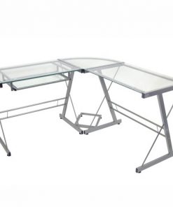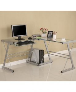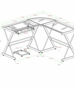 Architectural in styling and unmistakably modern, this Modern Corner Computer Desk in Metal and Glass provides ample workspace without weighing down the room. Durably fashioned from powder-coated steel tubing and tempered safety glass, the desk has an L-shape that fits neatly into corners and makes working more efficient. A sliding keyboard tray can attach to either side of the L, and a separate CPU stand is also included. Measuring 51 by 29 by 51 inches, the piece ships ready to assemble and coordinates with numerous Walker Edison TV and video stands for a fully coordinated home media room.