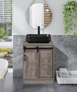 This Modern Farmhouse Bathroom Vanity w/ Barn Wood Sliding Door / Black Ceramic Sink is made of Eco-MDF wood for long-lasting durability. Careful Coverage and Eco paint enable durability. Sliding Door Design — Unlike traditional doors, sliding doors feel a sense of fashion. Open space meets various storage requirements. Cabinet: 19″x 24″x 31.5″(D×W× H); Sink dimension: 16.5″ x 5.5″ (W xD); Bowl thickness: 0.5″. Come with Vanity, Glass sink, ORB Faucet, Pop up drain, Hot/ cold lines, and some mounting hardware. Modern and stylish design fit perfectly with most bathroom decor; Easy installation.