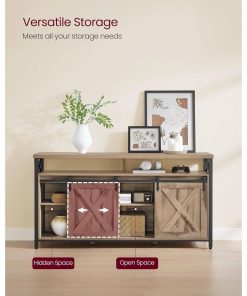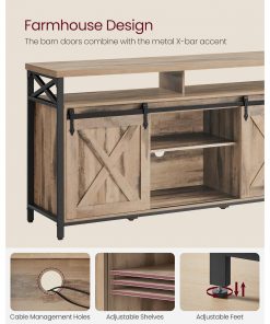 In addition to a 57.9 surface that fits TVs up to 65, this Modern Farmhouse TV Stand with Sliding Barn Doors for TV up to 65-inch with roomy storage boasts a sturdy structure thats made with particleboard and steel, able to hold up to 200 lb in total. 2 adjustable shelves behind the doors, 2 open compartments divided by an adjustable shelf, and an open shelf under the tabletopthey give your games, movies, and a media player a place of their own. A pair of sliding barn doors and X-frames for a farmhouse feel, plus a camel brown tone and steel accent for an industrial vibethey all combine in this TV unit to make a focal point in your living room. With clear instructions and labeled parts, setting up this TV cabinet has been made much easier. The convenient stoppers keep the doors on the rail; 2 cable management holes help organize and hide cables; adjustable feet keep the TV table stable on slightly uneven floors.