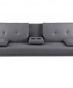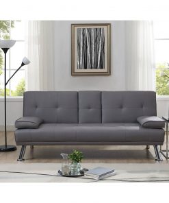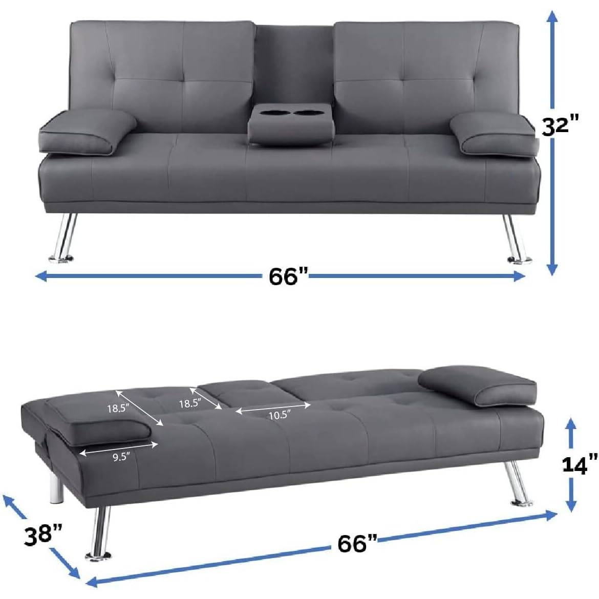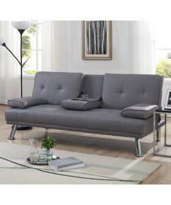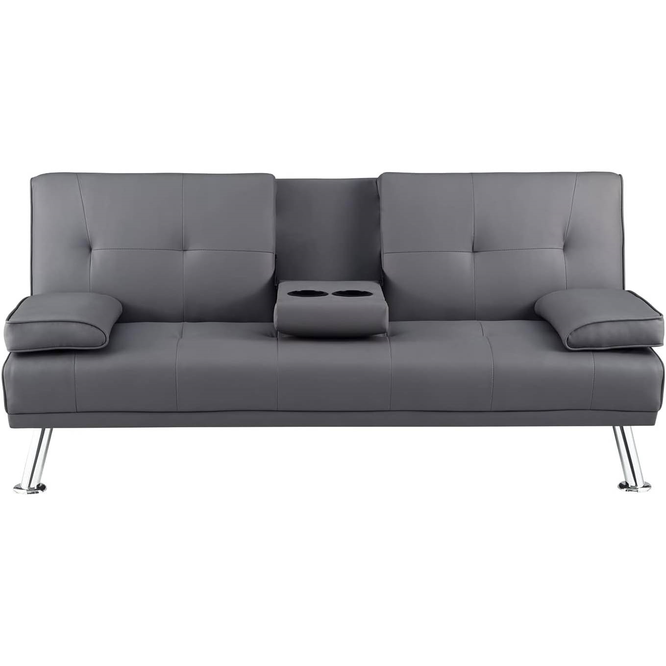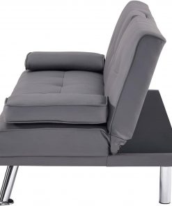 - Modern Futon Sleep Sofa Bed Couch in Grey Faux Leather with Cup Holder