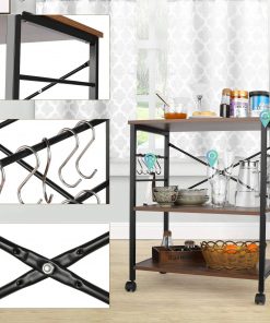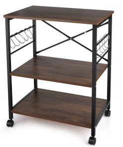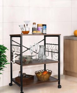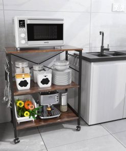 This Modern Industrial Black Metal Brown Wood Kitchen Baker’s Rack Microwave Cart is an industrial storage stand for kitchen living room decoration. Put a microwave oven or other kitchen appliances on the sturdy top shelf and store toaster, spice, dishes, and any other utensils on the 2nd or 3rd tiers. Configured 10 steel hooks make it convenient and easy to hang some cooking tools. An odor-free and anti-mildew ensures durability in storage and decoration. Equipped with 4 flexible wheels, 2 of which are lockable, allow the cart table to go where you go to take advantage of your cabinet space. You can effortlessly wheel it to the living room, office, or bedroom as a kitchen appliance cart, coffee stand, small rolling bookshelf or small bakers rack. The locks will keep it in a fixed position when needed.