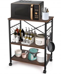 This Modern Industrial Black Metal Brown Wood Kitchen Baker’s Rack Microwave Cart is an industrial storage stand for kitchen living room decoration. Put a microwave oven or other kitchen appliances on the sturdy top shelf and store toaster, spice, dishes, and any other utensils on the 2nd or 3rd tiers. Configured 10 steel hooks make it convenient and easy to hang some cooking tools. An odor-free and anti-mildew ensures durability in storage and decoration. Equipped with 4 flexible wheels, 2 of which are lockable, allow the cart table to go where you go to take advantage of your cabinet space. You can effortlessly wheel it to the living room, office, or bedroom as a kitchen appliance cart, coffee stand, small rolling bookshelf or small bakers rack. The locks will keep it in a fixed position when needed.