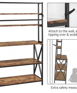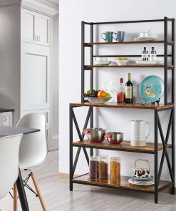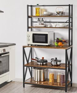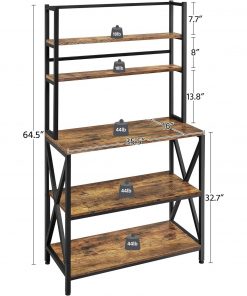 This Modern Industrial Metal Wood Bakers Rack Kitchen Storage Shelf with ample vertical storage climbs to functional heights. You can keep your jars and bottles of different heights on the 2 top shelves, and fill up the three lower shelves with pots and appliances. Crafted from CARB Phase 2 compliant particle board and powder-coated metal frame, this bakers rack brings you no worries about the harmful emissions at all. The laminated surface features excellent water-resistance and is easy to clean. Our Kitchen storage shelf is not only a rack for the oven, microwave, coffee pot, toaster and blender, but also an organizer to store other items. It can be used in the kitchen, living room, dorms, apartments, craft rooms, etc. Constructed of 1.5cm/0.6 thick particle board and 2x2cm/0.8×0.8 metal square tube, this utility storage shelf boasts robust support for your kitchen items. With this rustic utility kitchen rack, you can corral clutter in the kitchen, living room, dining room without sacrificing style. It can blend with a variety of styles, especially rustic barn-style and industrial design.