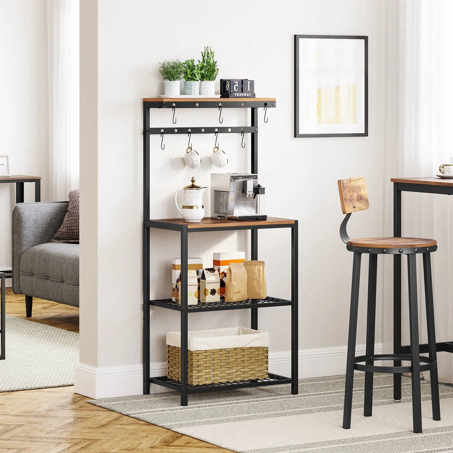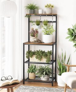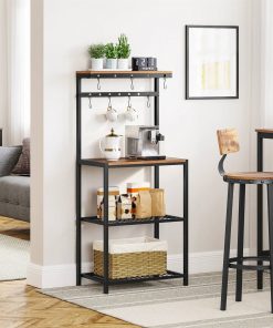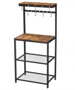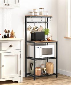 Turn to This Modern Industrial Metal Wood Bakers Rack with Microwave Shelf…for extra counter space in the kitchen, an empty corner in the dining room, or any home lacking a coffee bar. Standing at 23.6″L x 15.7″W x 59.6″H, it offers oodles of storage without overwhelming your space. Its Big Capacity Comes From…4 storage shelves and 12 S hooks. Your cereal bottles go on the top, microwave on the large surface, and boxes on the 2 mesh shelves…what’s even better is that the 12 hooks keep mugs and pans at your fingertips. Its Stability Comes From…strong 0.8″ x 0.8″ steel tubes and quality particleboard for the firm structure of this kitchen shelf, as well as adjustable feet on the bottom that help keep everything in place, even on uneven floors. Its Timeless Flavor Comes From..the rustic romance pairing with steel toughness. Spice up your kitchen with this metal baker’s rack that brings a relaxing industrial vibe into life.