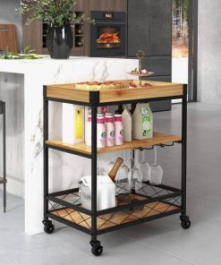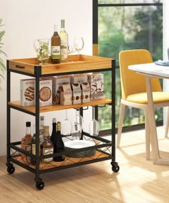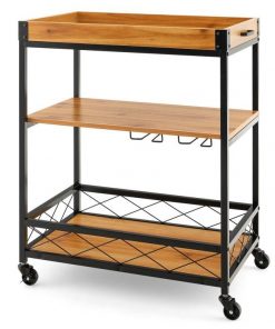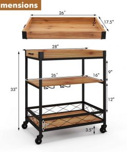 - Modern Metal Wood Shelf Kitchen Serving Bar Cart with Removable Top Tray