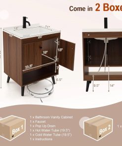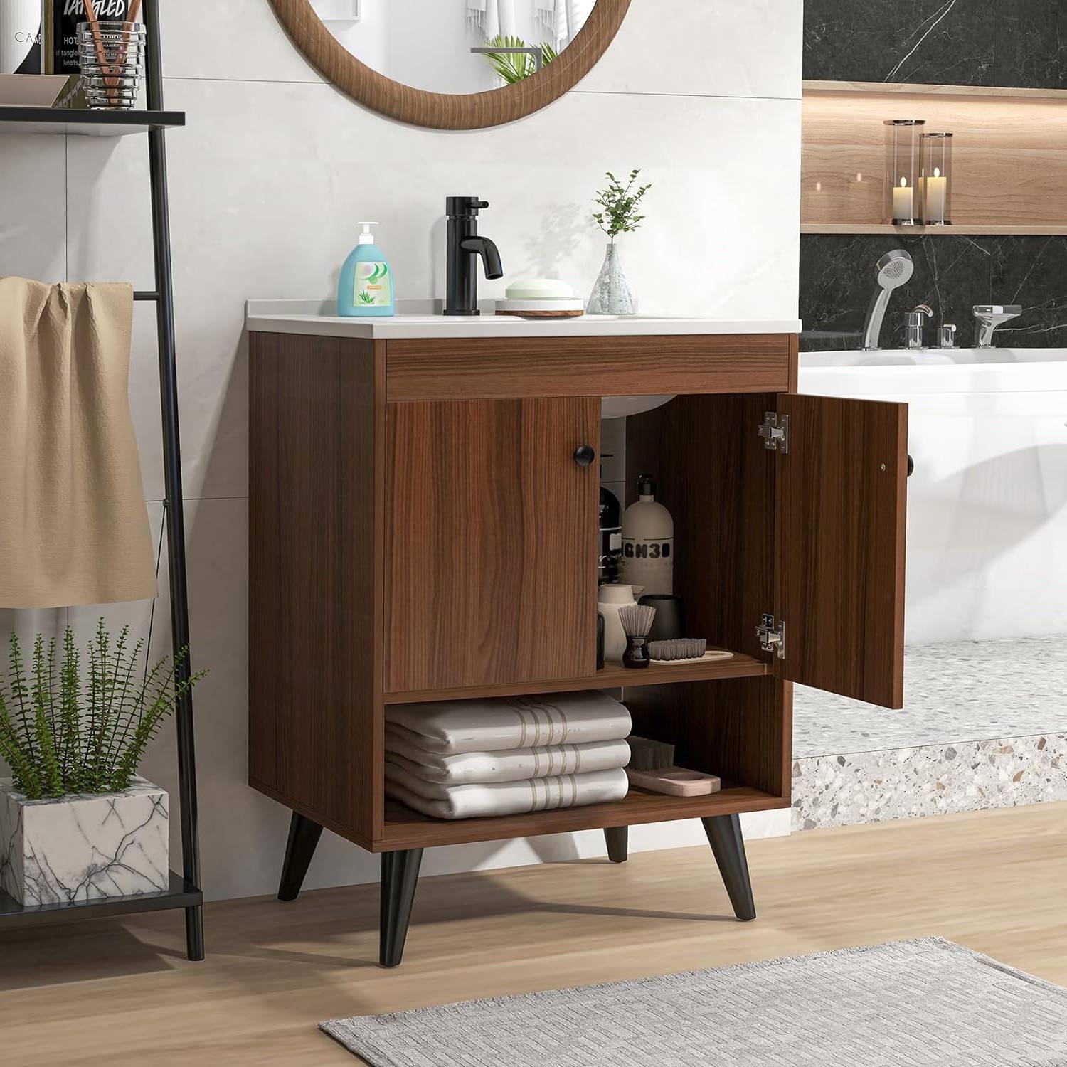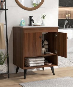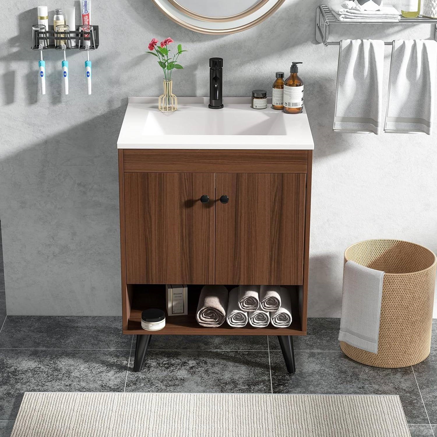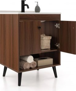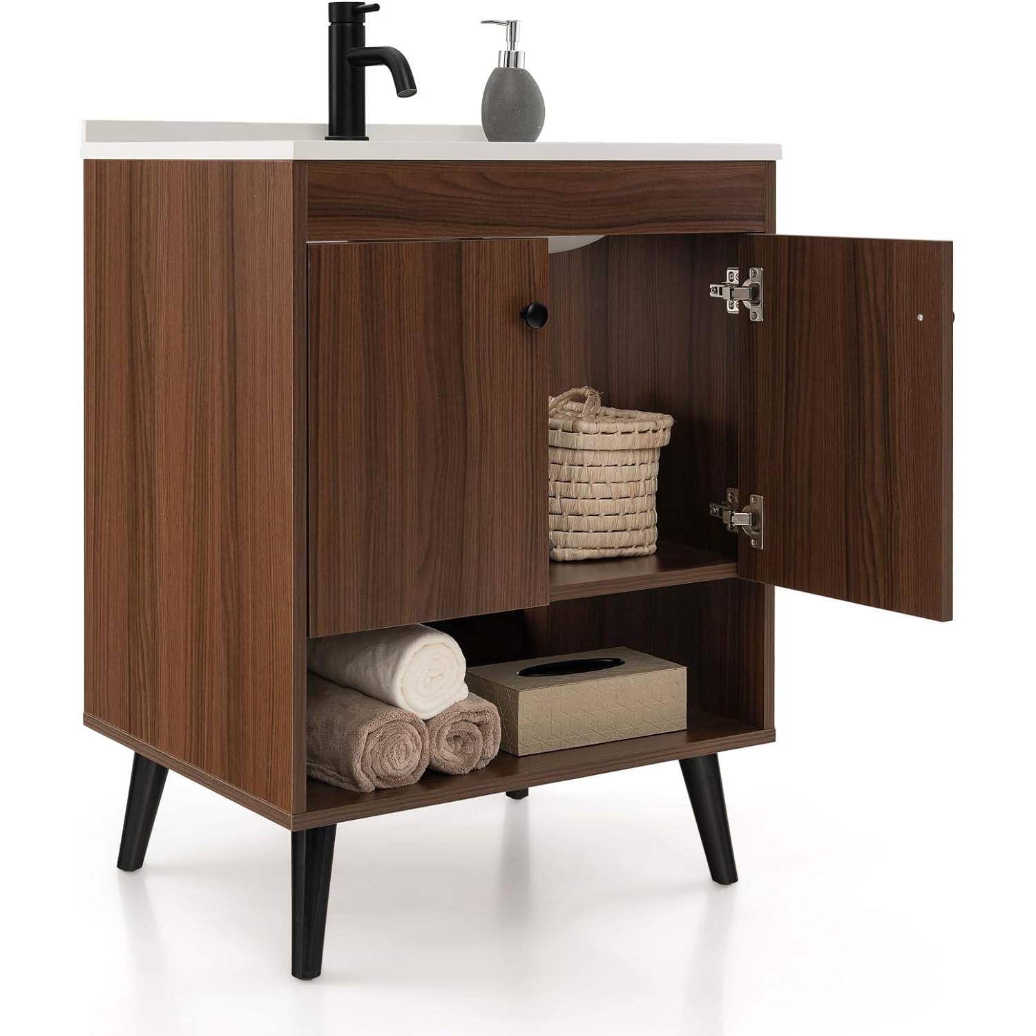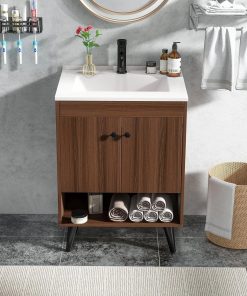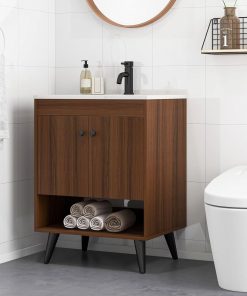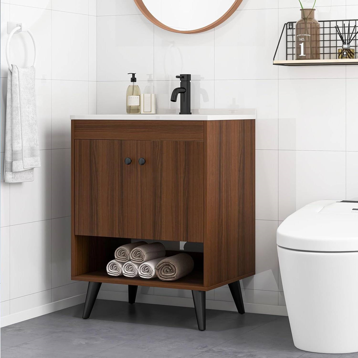 This Modern Mid-Century Bathroom Vanity in Walnut with Sink Faucet and Drain provides everything you need! The bathroom storage cabinet comes with a sink, a stainless steel faucet, a pop up drain and other required accessories. The glossy sink is designed in a curved shape to drain water quickly, and the pop up drain is convenient to use. The 2-door cabinet and an open shelf provide ample storage space for toiletries, towels and more. For increased security, you can fix the cabinet to the wall with 2 anti-toppling devices. Our sink is thoughtfully designed with a raised backsplash, a pop-up sink drain, and an anti-spill hole for effortless cleaning. Installing the included stainless steel faucet is a breeze with the pre-drilled faucet hole. Our bathroom vanity offers abundant storage options with its 2-door cabinet and open shelf, optimizing space efficiency in your bathroom. Whether you prefer concealed or open storage, this vanity caters to your diverse needs. Crafted with E0 multi-layer boards, our bathroom storage cabinet is built to withstand the test of time. The durable hinges and sturdy supporting legs provide reliable stability. The rustproof stainless steel faucet and accessories ensure long-lasting quality. The package includes 2 anti-toppling devices, making this vanity safe for families with children and pets. Its simple and elegant design effortlessly blends with any bathroom decor style.