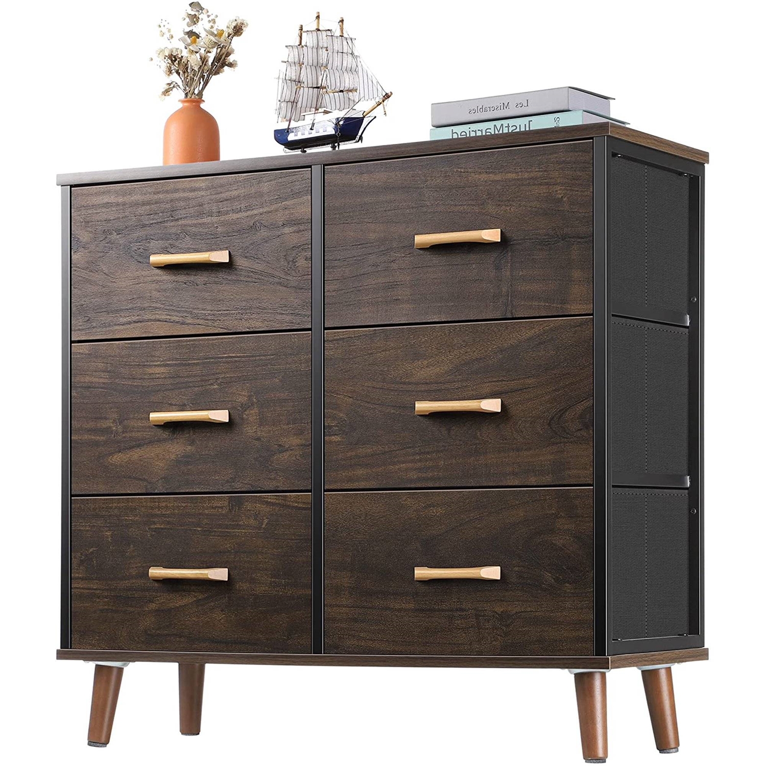 - Modern Mid-Century Style 6-Drawer Bedroom Dresser with Fabric Drawers in Walnut